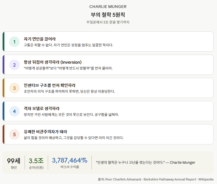 멍거의 철학을 “대단하네, 감동적이네”로 끝내는 것은 낭비입니다. 그는 추상적 조언을 싫어했습니다. 그의 방식으로, 구체적으로 정리하겠습니다.