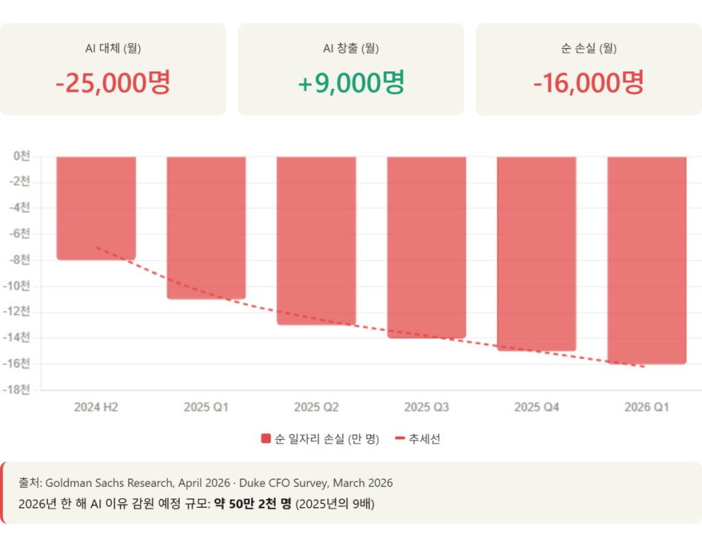 - Goldman Sachs(2026.4): AI가 미국에서 매달 순 1만 6천 개 일자리를 지우는 중