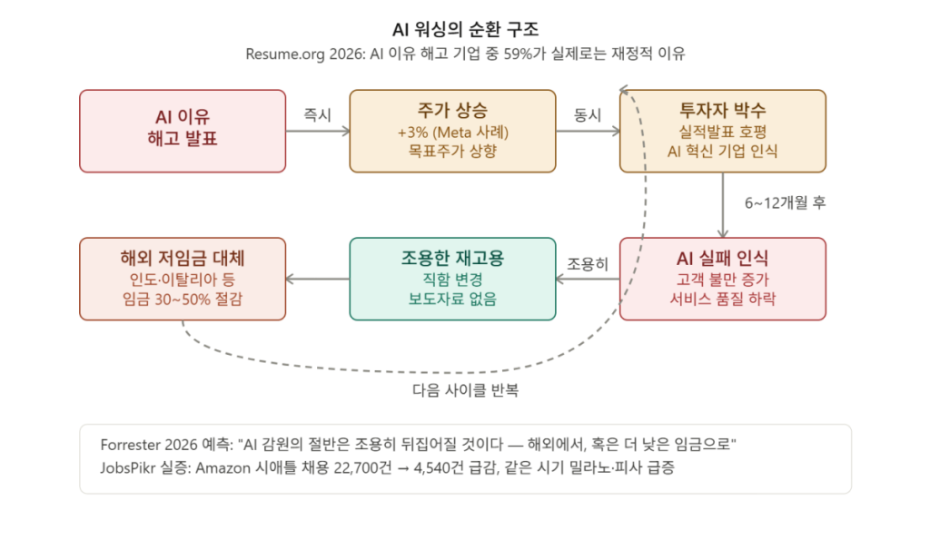 [이미지 3: AI 워싱 구조 도식 — “AI 이유 해고 발표 → 주가 상승 → 분석가 목표주가 상향 → 6개월 후 조용히 재고용 또는 해외 저임금 대체” 플로우차트, 다크톤] 출처: Forrester Research 2025, Resume.org 2026, Brookings Institute 2025