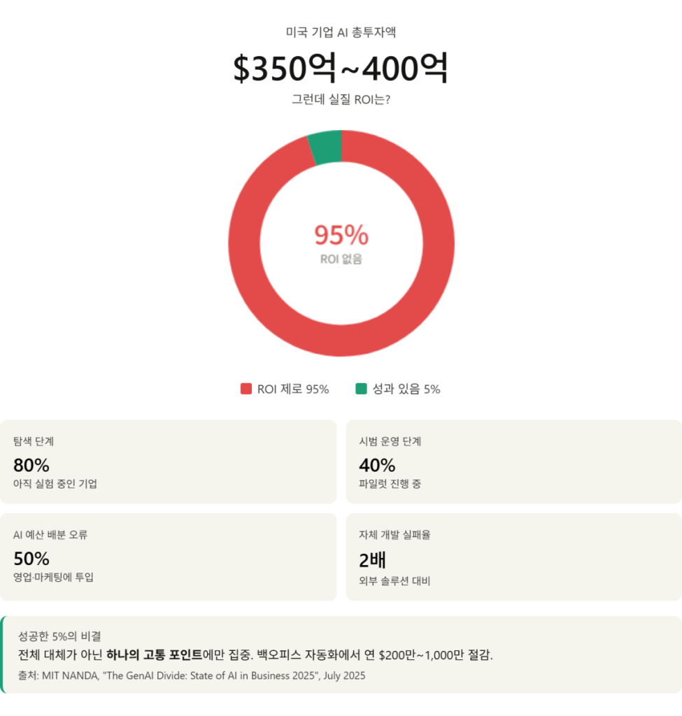 - MIT(2025.7): 기업 AI 투자 **95%**가 실질 ROI 제로 — 투자 총액은 350억~400억 달러