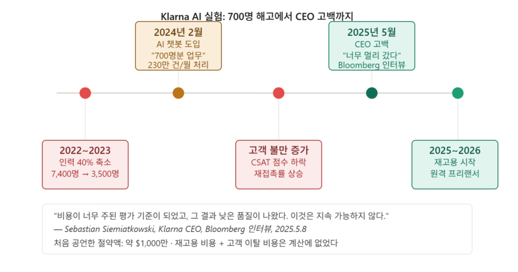 [이미지 5: Klarna AI 대체 타임라인 — “700명 해고(2023) → AI 챗봇 운영(2024) → 고객 불만 증가 → CEO ‘너무 멀리 갔다'(2025.5) → 재고용 시작” 다크톤] 출처: Bloomberg May 2025, Klarna 보도자료 2024, CX Dive May 2025, Digital Applied March 2026