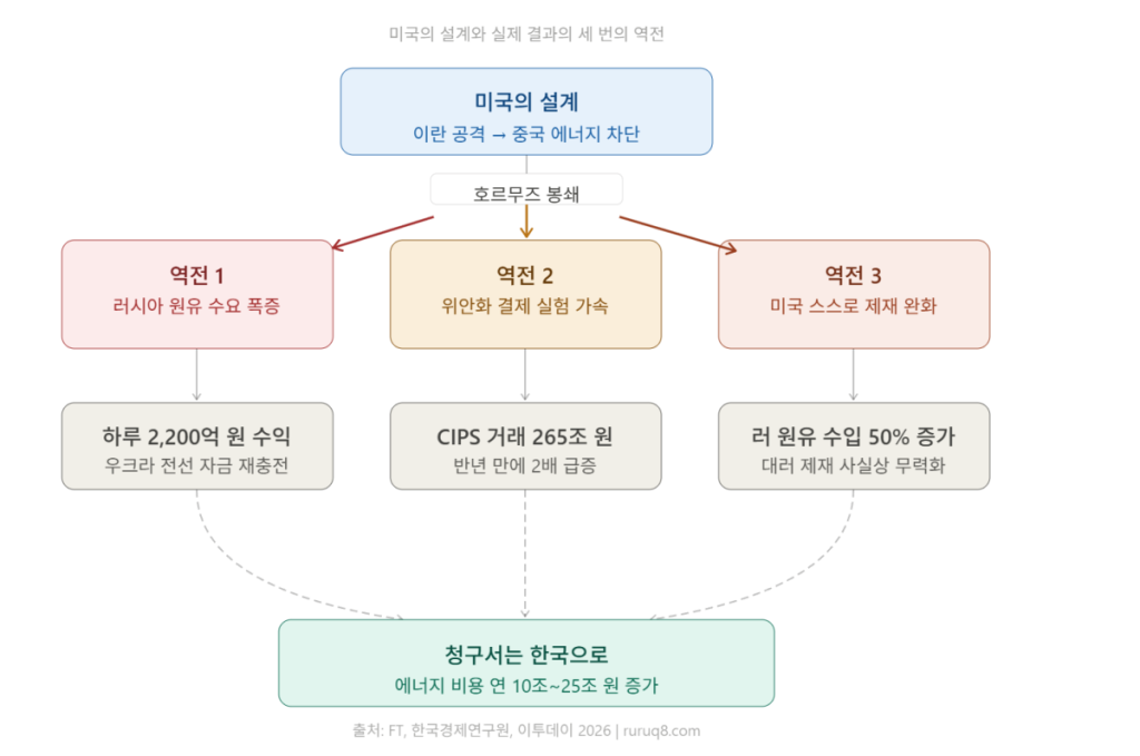 [핵심 요약] 2026년 2월 28일, 미국이 이란을 폭격했습니다. 명분은 핵이었습니다. 그런데 전쟁 직후 미국 재무부가 제재한 건 이란 기업이 아니라 중국 정유소였습니다. 이 전쟁의 진짜 표적은 처음부터 중국이었습니다. 중국이 이란을 통해 20년간 조용히 진행해온 달러 패권 무력화 실험을 끝내려는 설계였습니다. 그런데 결과는 정반대였습니다. 러시아가 하루 2,200억 원을 벌었고, 위안화 거래액은 사상 최대를 찍었으며, 청구서는 한국으로 날아왔습니다.